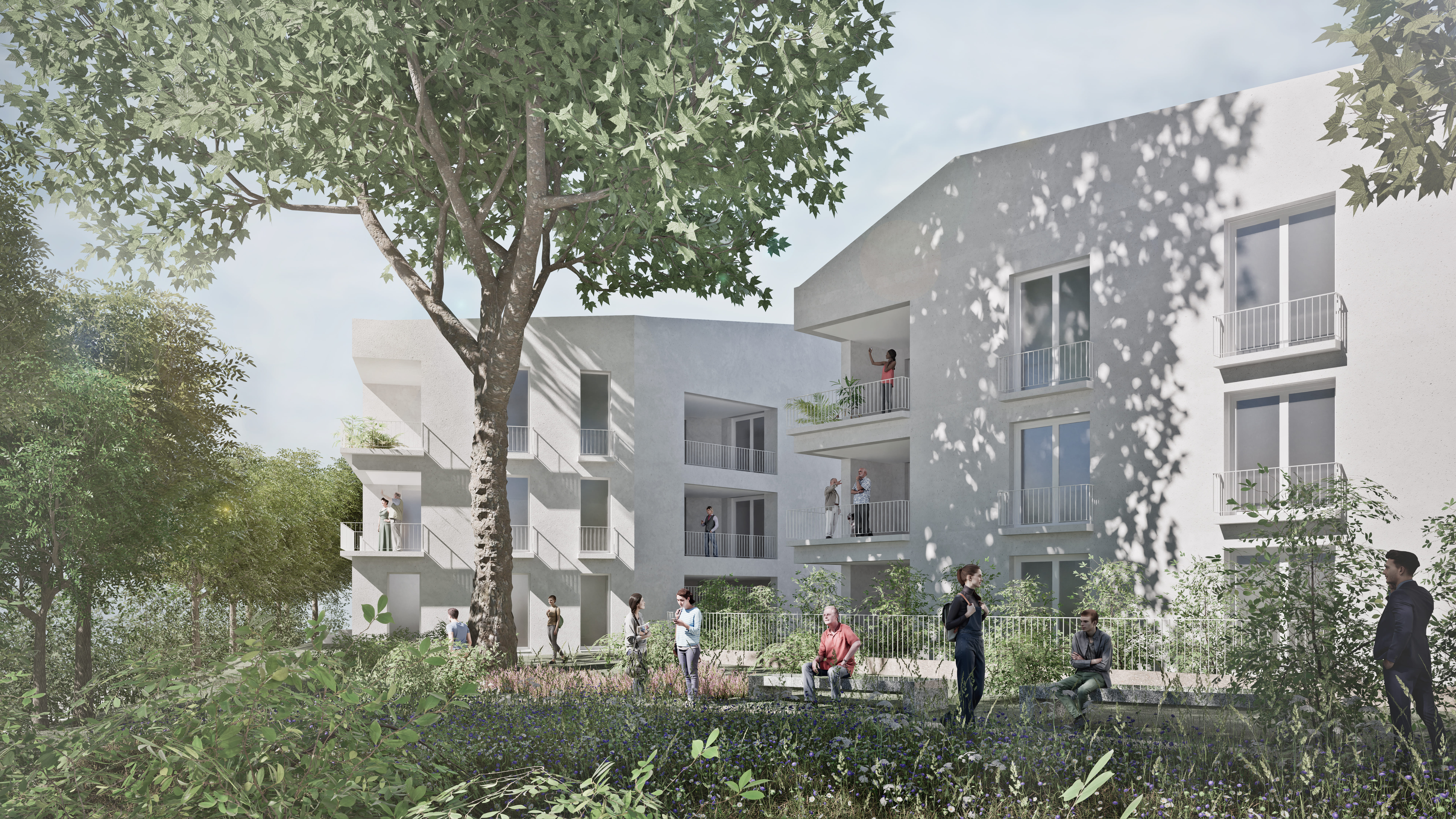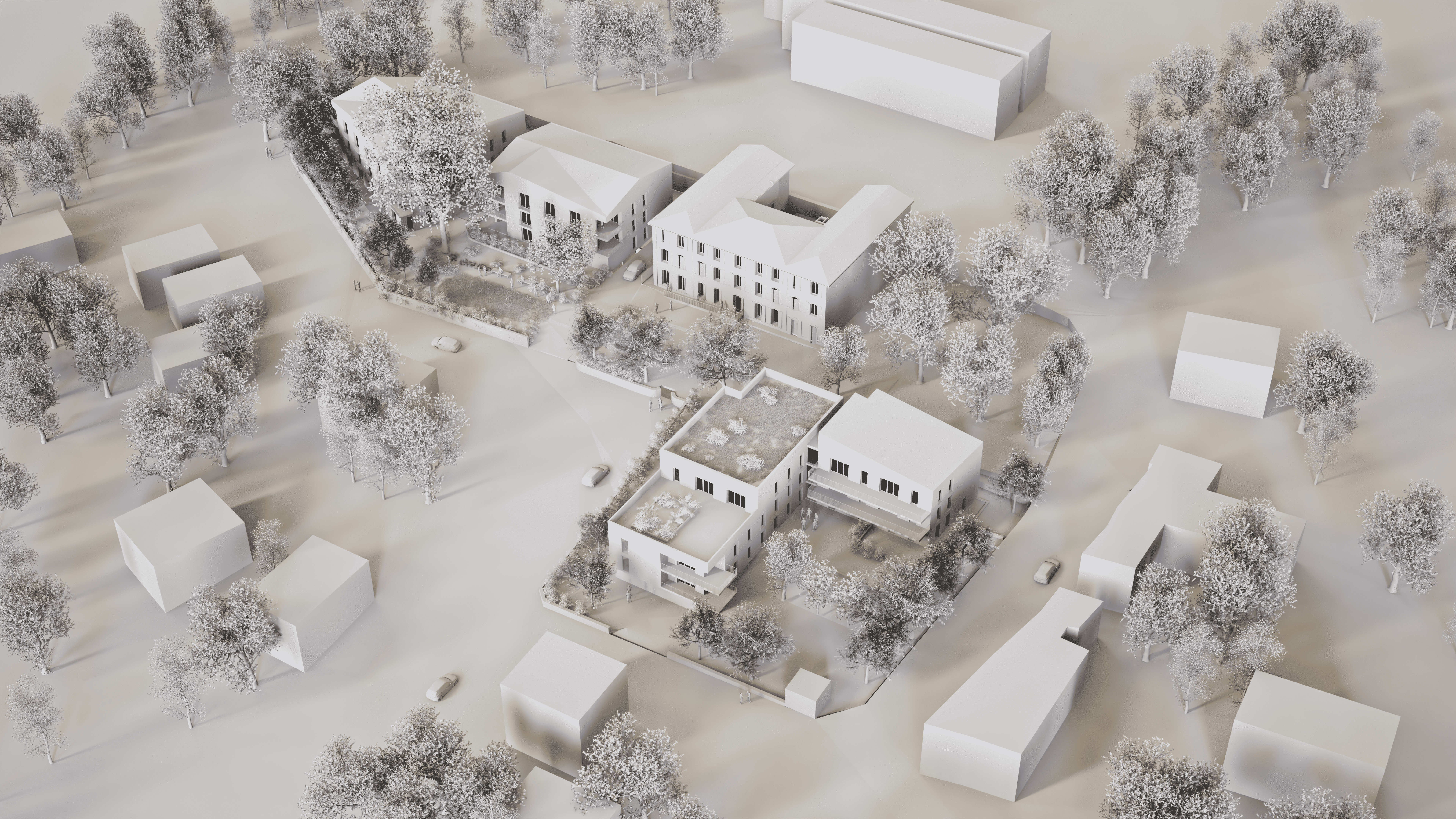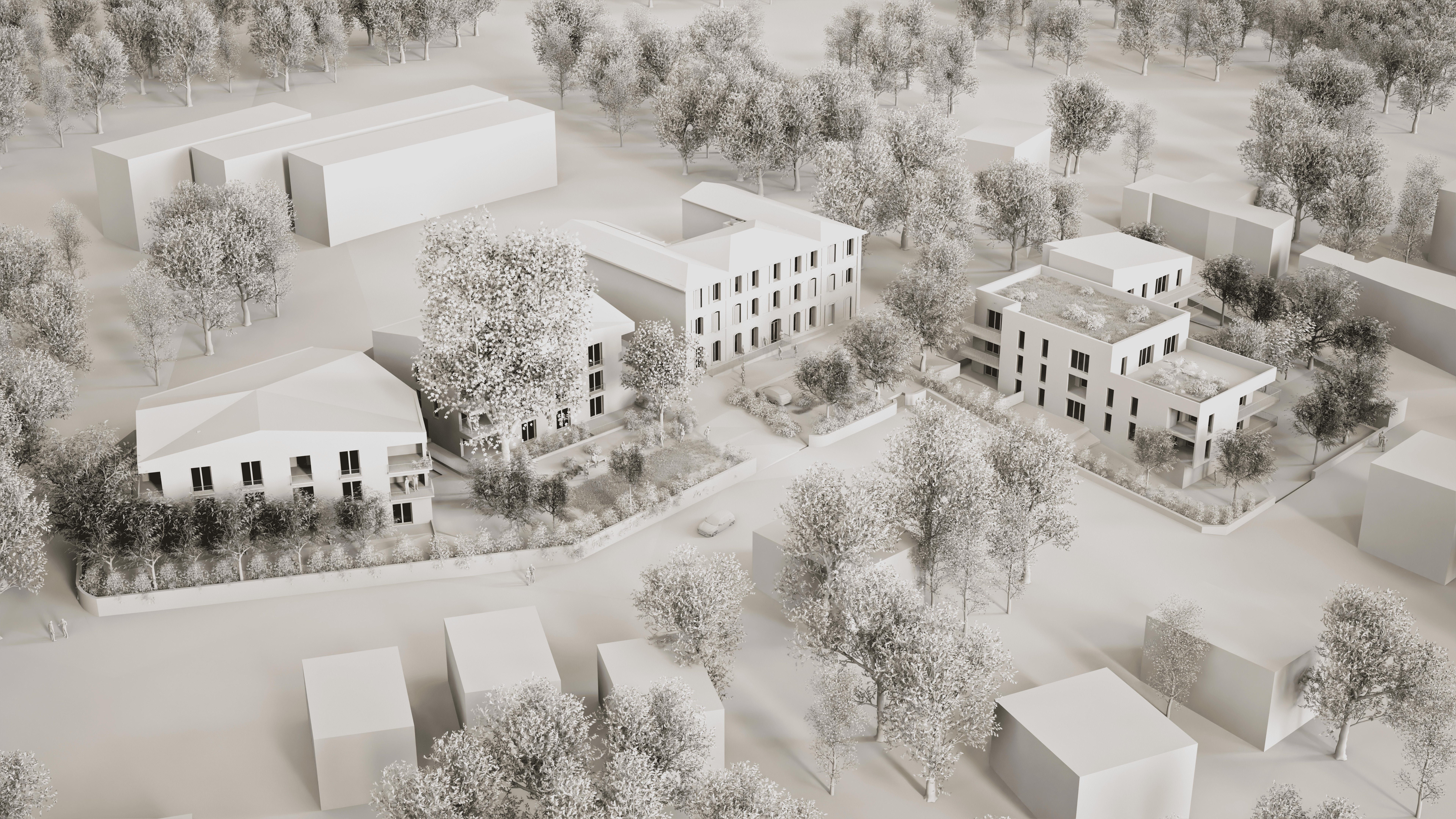 Au cœur du vallon de Régny, le projet révèle et réhabilite La Grande Bastide comme figure patrimoniale centrale du site. Autour d’elle, trois bâtiments résidentiels s’implantent avec sobriété et déférence ; ils dialoguent avec la topographie, la végétation existante et l’environnement pavillonnaire. La bastide restructurée accueille une pension de famille de 29 logements, pensée autour de transparences nouvelles et d’un cœur d’îlot végétalisé favorisant la cohésion sociale.