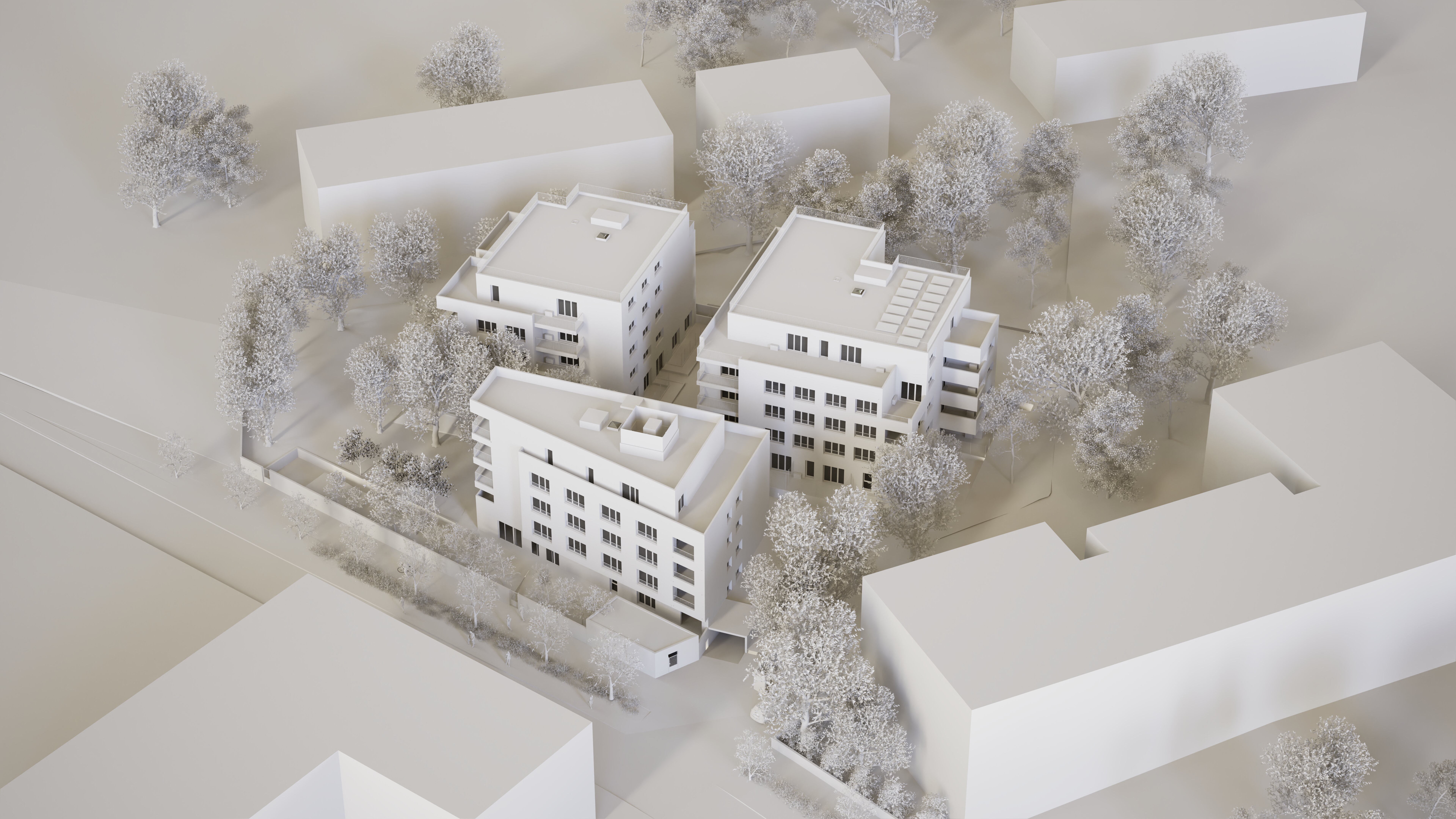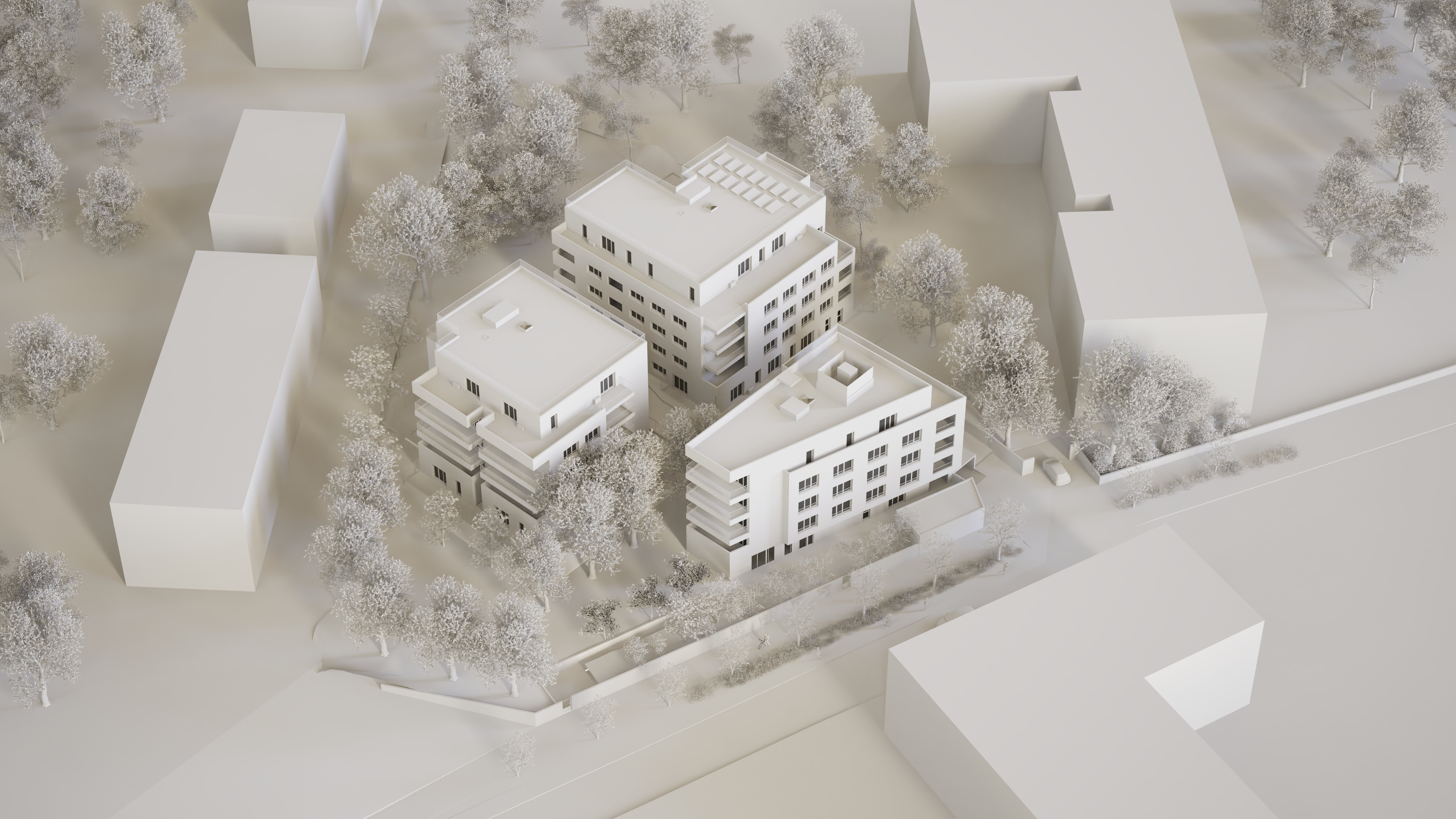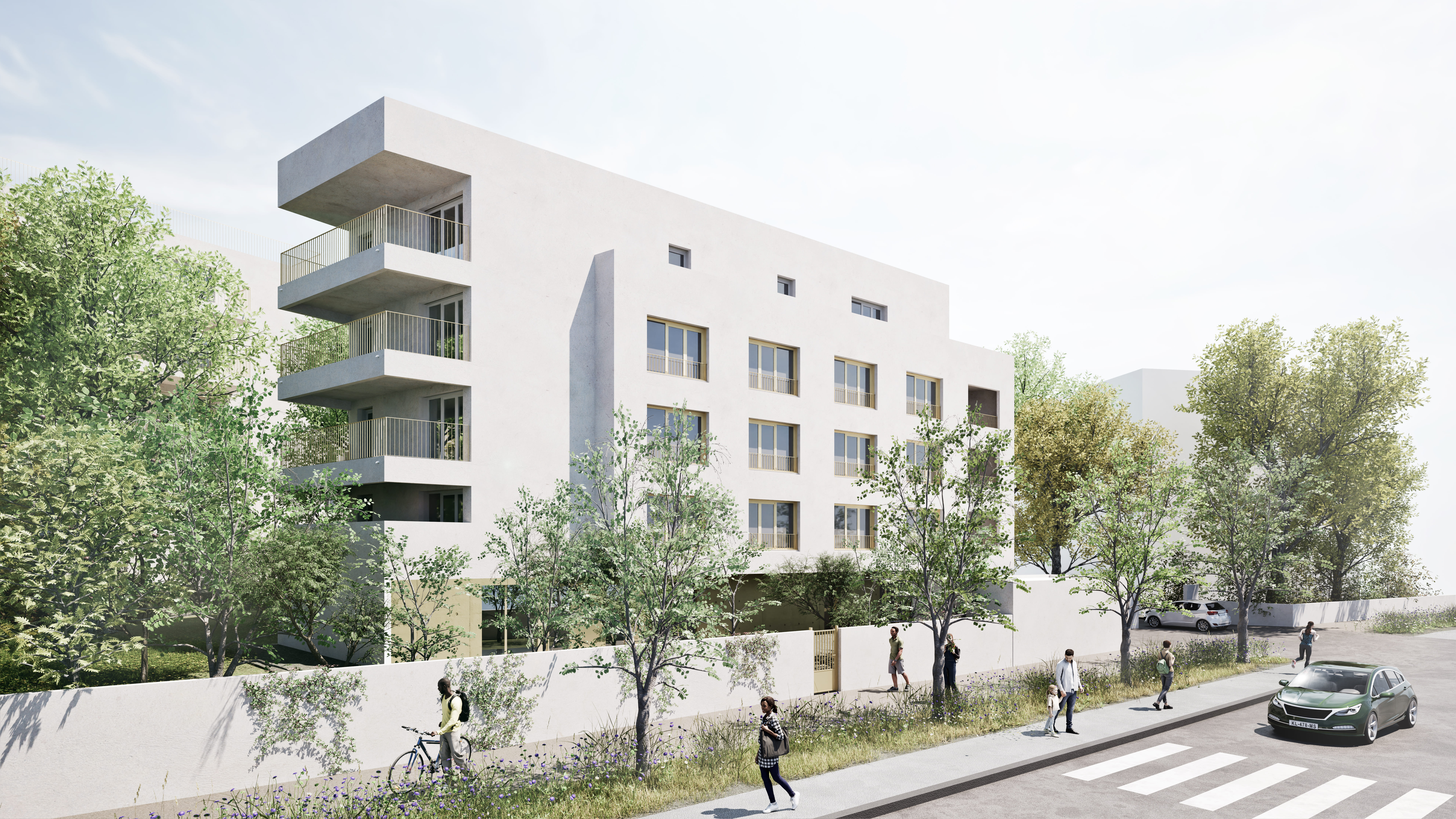 Implanté dans le quartier de Château Gombert, le projet s’organise en trois volumes distincts, glissés dans un couvert végétal conservé et renforcé. L’implantation privilégie la trame paysagère existante et structure des transparences depuis l’espace public jusqu’au cœur d’îlot. Les gabarits en R+3 et R+4 répondent au tissu résidentiel et se fragmentent afin d’assurer les continuités végétales. L’écriture architecturale, sobre et rigoureuse, s’appuie sur une trame de baies horizontales généreuses et une matérialité claire, minérale.